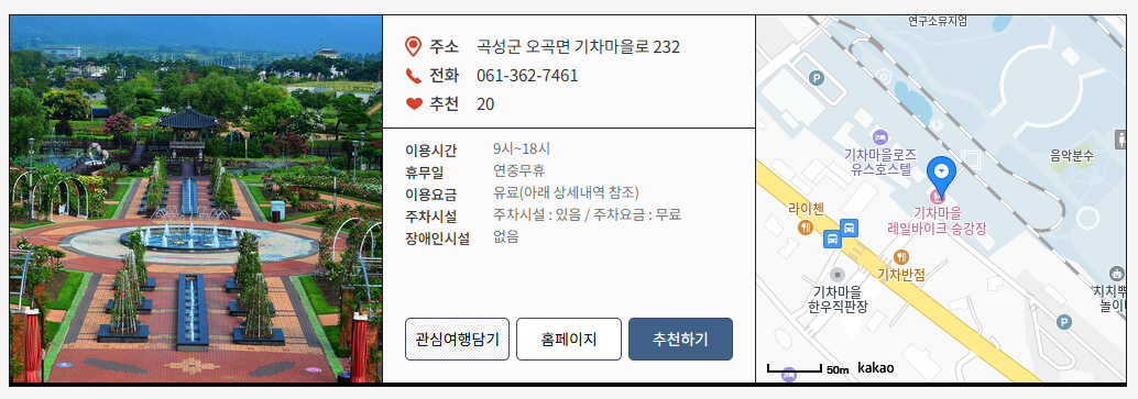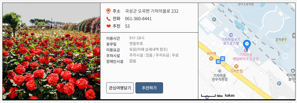| 근처 관광지 | 섬진강 기차마을 레일바이크 / 가정역 철도마을 / 태안사 |