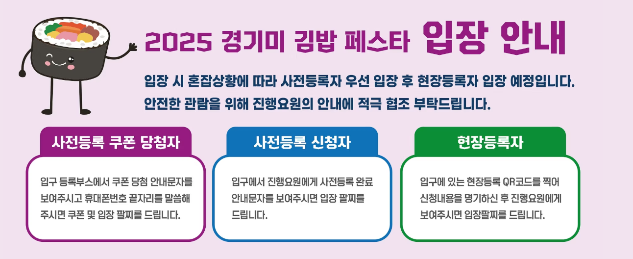 사전등록은 경기미 김밥페스타 공식 홈페이지 또는 SNS 링크를 통해 간단히 할 수 있어요.
